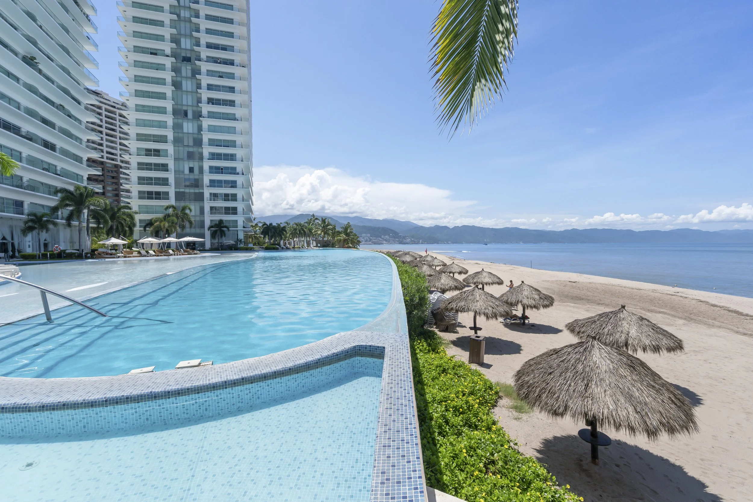 This Gorgeous beachfront 2 bedroom 2.5 bathroom. In the luxurious Grand Venetian. With views of the ocean and the surrounding mountains. Features 2 terrace, ocean view and mountain view. Recently renovated, fully furnished, granite countertops, stainless-steel appliances, laundry closet with stackable, parota wood furniture, deeded underground parking and an excellent rental history. The Grand Venetian is condo living in a resort setting. It offers direct beach access, gated security, 5 spectacular pools, hot tubs, beach palapas, tennis courts, games room, full gym, spa (steam/sauna/massage room), private movie theatre, 24 hr security and an on-site restaurant with room serve and a 10% discount for owners. Located in the desirable hotel district. This condo is ready for you to enjoy.